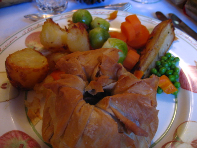 Homemade phyllo parcel filled with mushrooms, leeks, chestnuts, onions, etc. Roasted potatoes, Brussels sprouts, carrots, parsnips, peas.