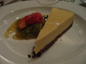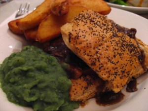 Mixed mushroom and ale pie with minty mushy peas an chunky chips. Ginger tofu cheesecake with rhubarb compote. From Mildred’s in London. (Go there, all veg, tons of vegan options).