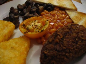 Real Scottish Breakfast. Vegetarian haggis, potato triangles, baked beans & toast, fried mushrooms and baked tomato.