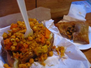 Vegetable curry baked potato with vegetarian haggis samosa.