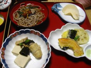 Dinner:Soba (buckwheat noodles) with mushrooms, pears, vegetable tempura, stuffed tofu, koyadofu (dried tofu), konbu seaweed