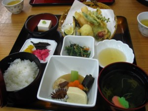 Lunch: gomatofu, veggie & fruit tempura, tempura dipping sauce, hot soba soup, cold veggies: koyadofu, konbu, veggies, tofu burger & soy jerky, rice, pickled vegetables, and cold greens (center)