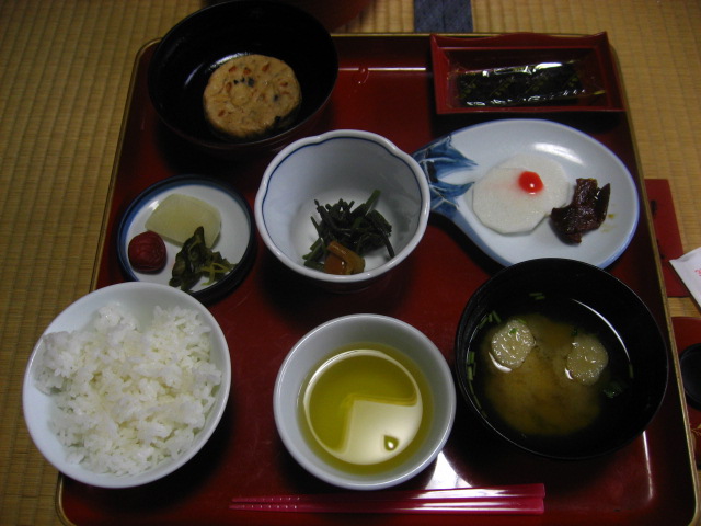 Breakfast: tofu burger, wrapped seaweed, stick potatoes with plum sauce (“eggs”), soy jerky, miso soup with gluten chunks, hot green tea, rice, pickled veggies, cold greens (center)
