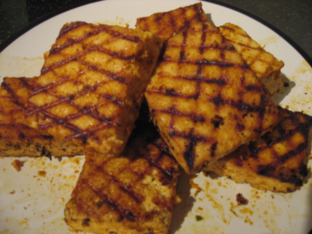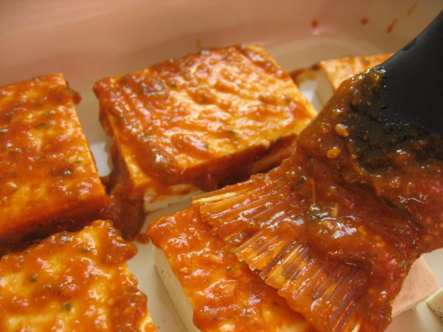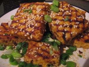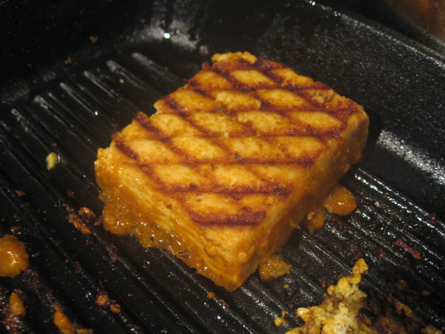 Shake off excess sauce and grill tofu, brushing with sauce. Sprinkle with roasted sesame seeds and scallions. (Grill marks are great for impressing guests, but next time I will just do it in a frying pan)