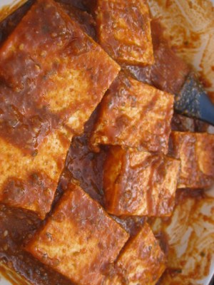 Cut tofu into 1″ blocks. Drain well on paper towels. (I cut it into 8 rectangles)
