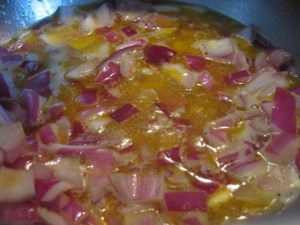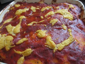 • Pour a layer of tomato sauce on top. Once again, this could be everything, or just enough for one layer.