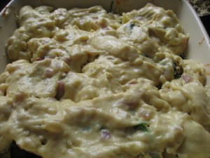 • In your baking dish, lightly cover the bottom with a layer of bechamel sauce.