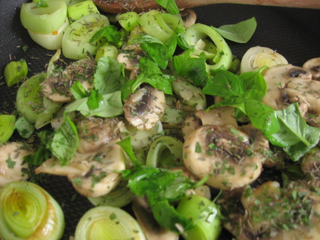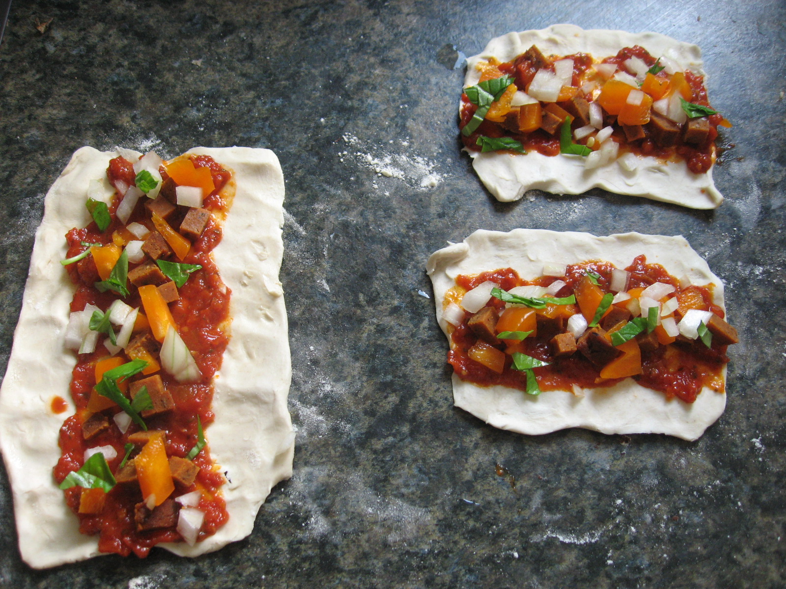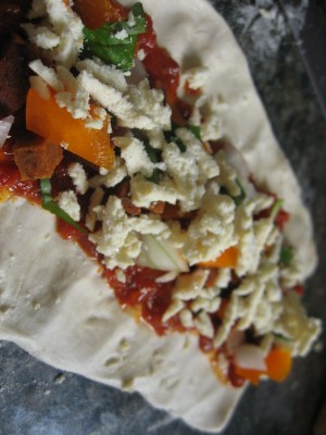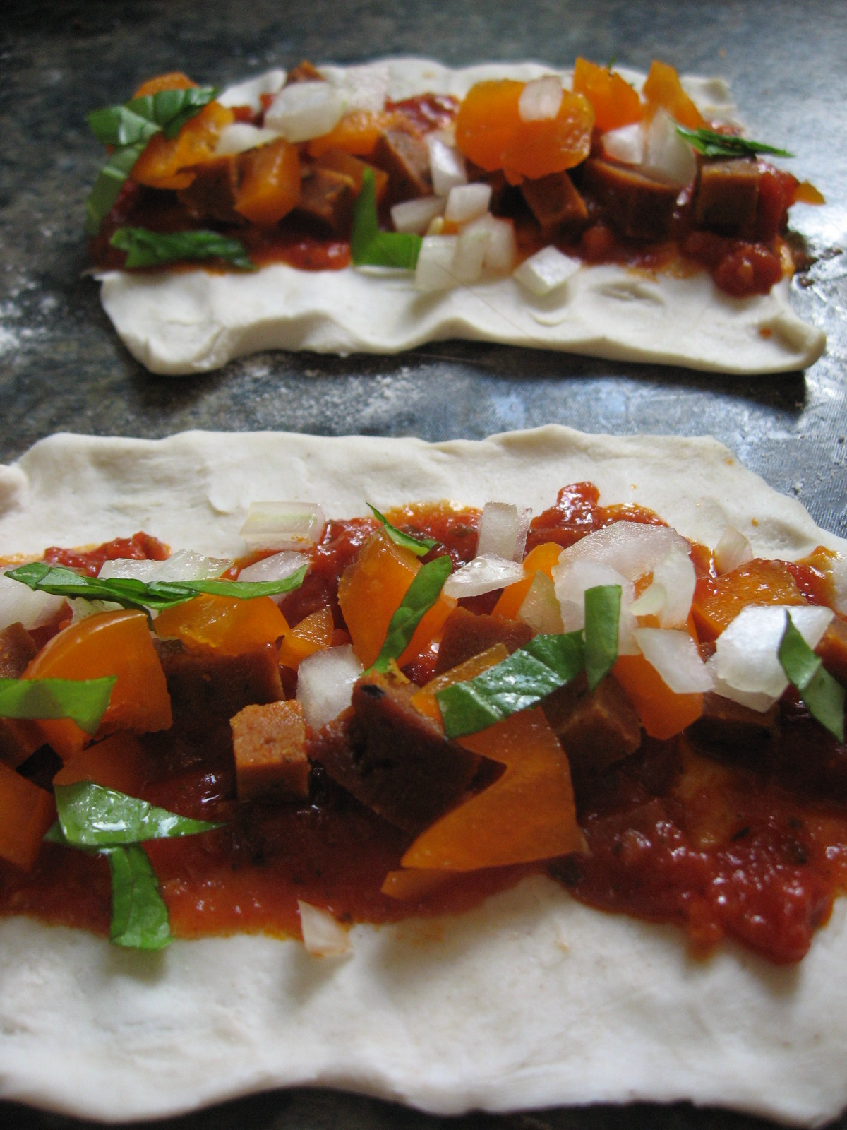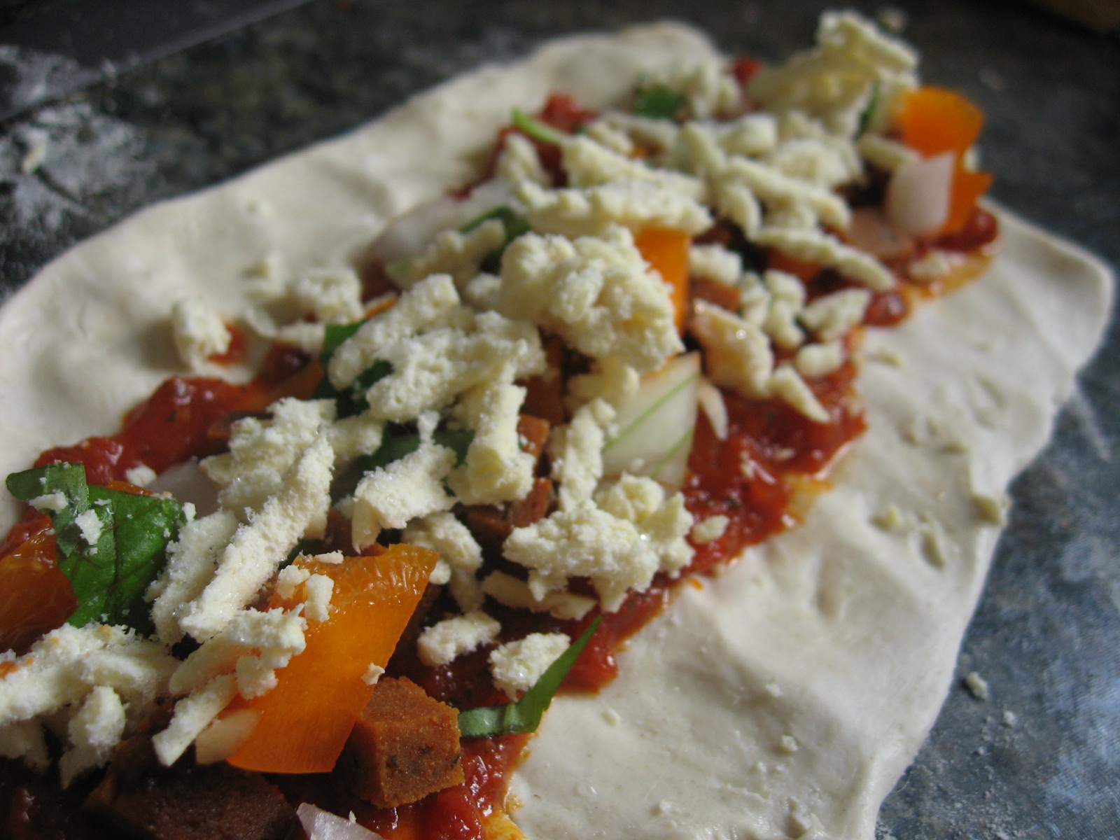 I used: Sun-dried tomato pasta sauce, onions, orange pepper, leftover seitan, fresh basil, Daiya shreds.
