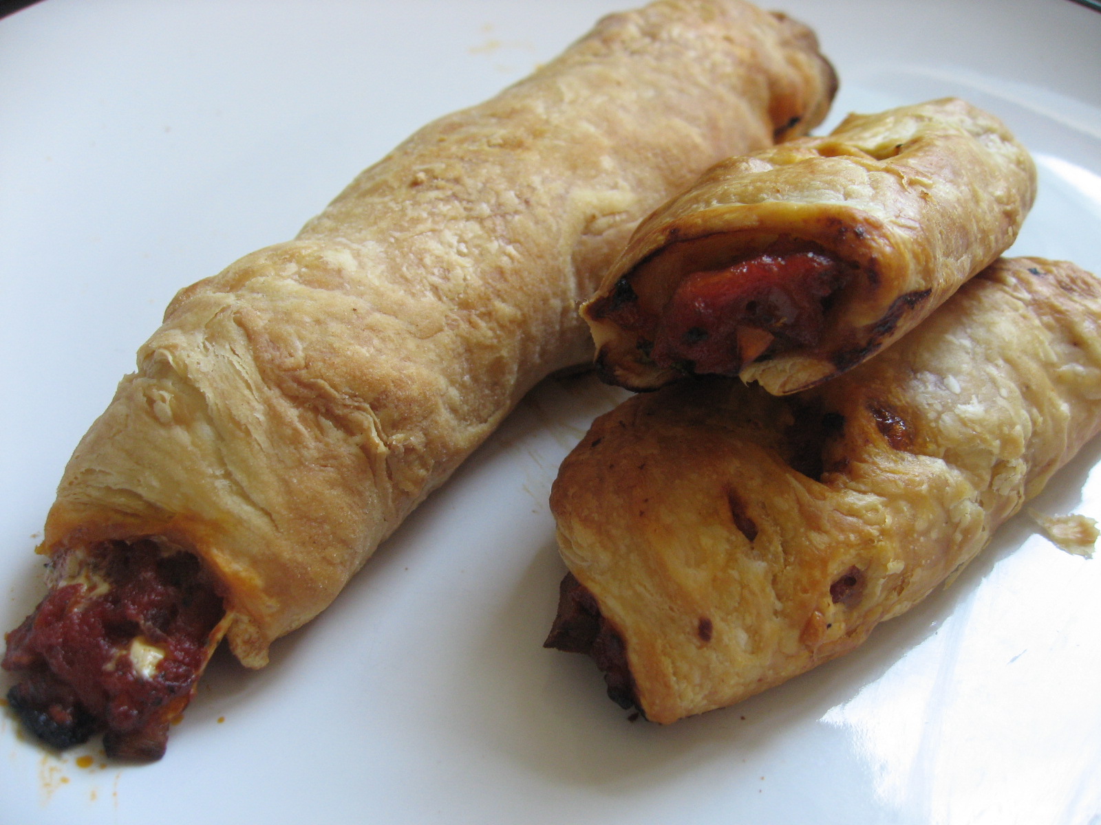 Roll out the your dough into a rectangle any size you like. Put fillings length wise, as if you’re making sushi.