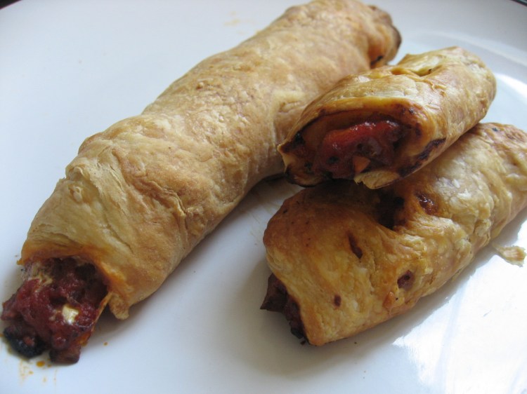 *I’ll be honest here, I went ghetto. I got this block of puff pastry and it is so convenient! I just rip off a chunk any time I need to make something: pizza rolls, mini pizzas, mini pot pies, garlic twists, hot pockets, pasties, pinwheels filled with whatevs, etc.